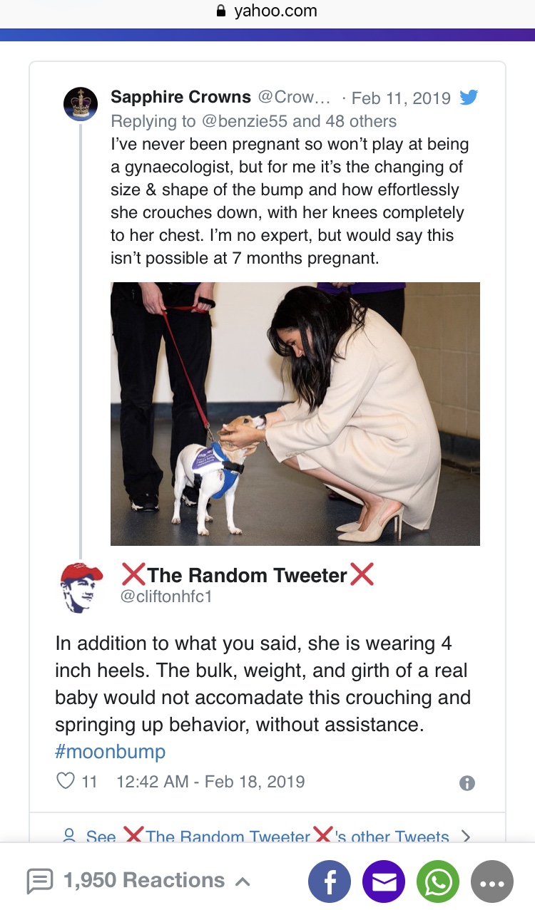 In it, she publishes screenshots of a series of tweets, where some of us question Meghan’s pregnancy. Amongst ourselves. Not including (or bothering) anyone else. Which is apparently illegal these days. Did she ask our permission to post this on a global news outlet? No, she didn’t.
