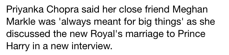 Ok, so I don’t know if everybody saw this one, but last week, an article came out taken from an interview with Priyanka sometime before Archie was born – stating that she “knew Meghan was always destined for big things”.