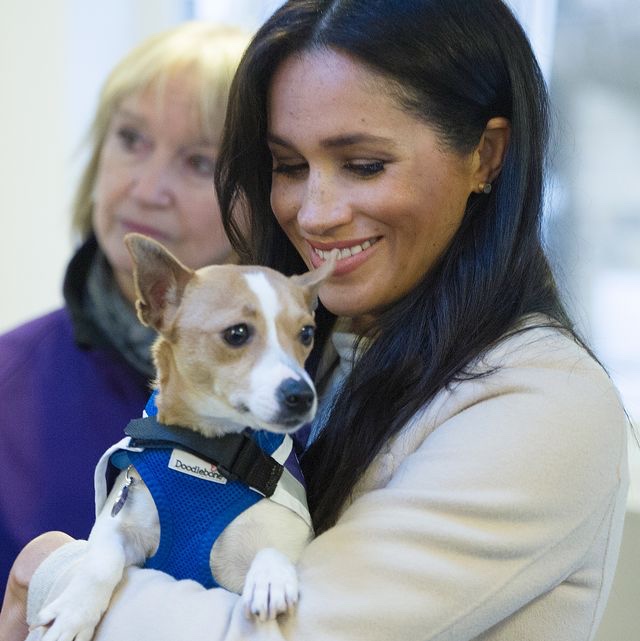 My first glimpse of Meghan in this new chapter is her crouched in the entryway, arms wrapped around her black Lab, Pula (Setswana for rain and good fortune and a tribute to an early date during the couple’s whirlwind romance in 2016). The front doors are thrown wide open, as are the doors leading out to the backyard. She stands and smiles with the perfect level of warmth, the gleam of her teeth rivaled only by the shininess of her blowout.