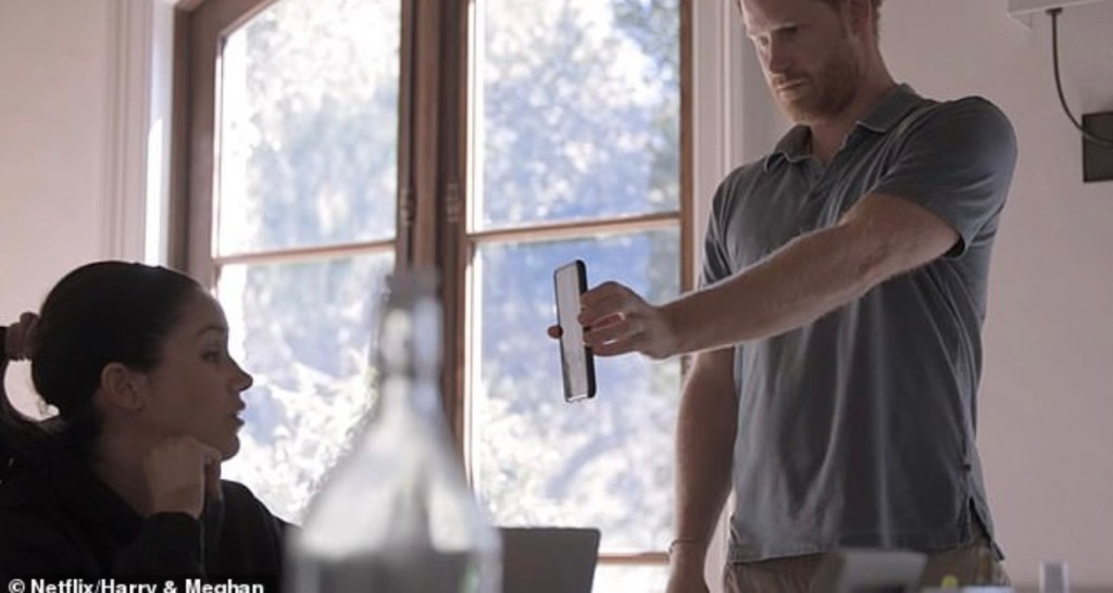 We’ll start with the moment their Netflix crew just so happened to capture Harry getting a text from William, evoking a dramatic reaction from Harry.