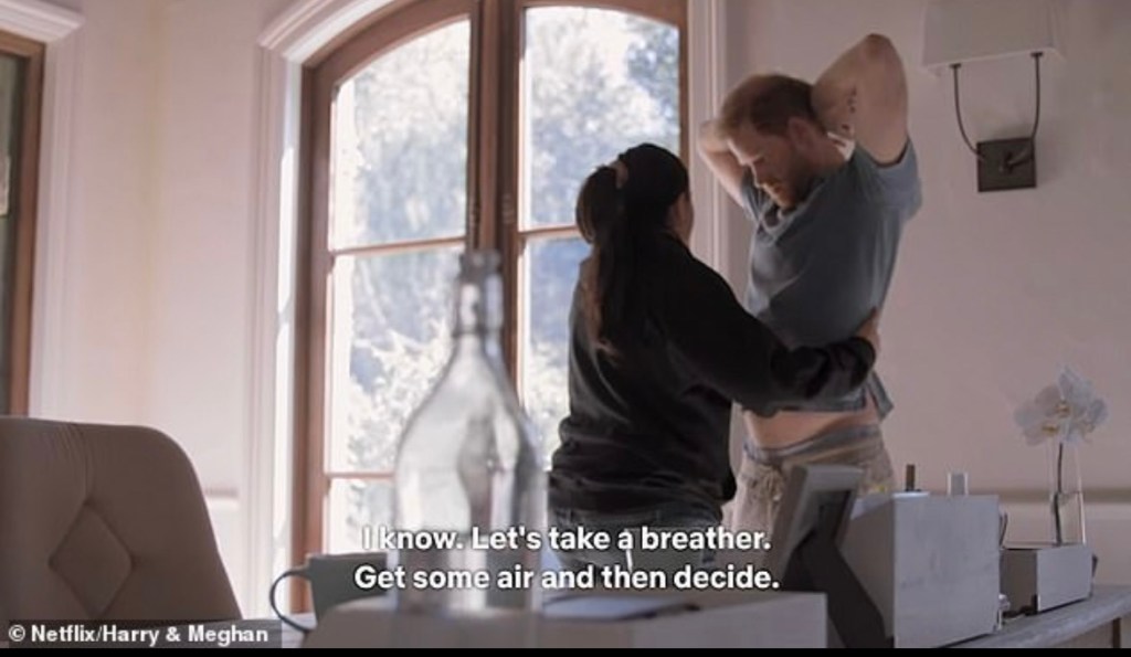 Meghan proceeds to tell Harry to “get some air and then you can decide”. What he’s meant to be deciding, I’m not sure. Probably trying to choose between Mexican and Indian for dinner. Either way, I didn’t even know he could think for himself anymore.