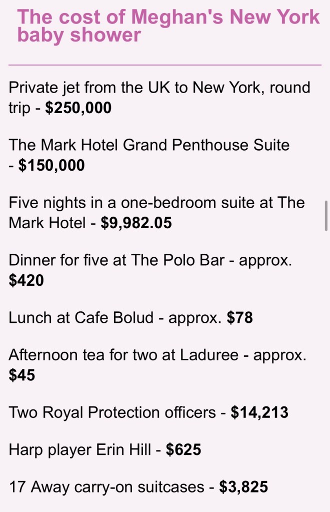 But it wasn’t long before Meghan was pregnant with their first child and throwing a lavish baby shower in New York City with a bunch of hangers on friends who made sure they were there for the big occasion.
